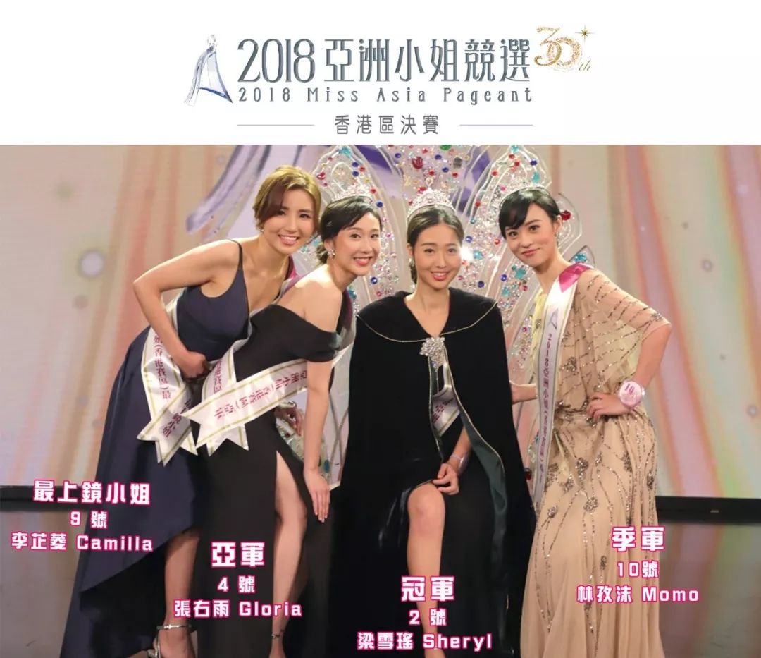 《2018亞洲小姐競選》香港賽區決賽剛剛(10月7號晚)結束,今晚決賽總共有五個獎項,其中IG人氣大獎由9號李芷菱奪得,其後更獲得「最上鏡小姐」,但她最終無緣三甲。而三甲順位則是季軍10號林孜沫、亞軍4號張右雨和冠軍2號梁雪瑤。