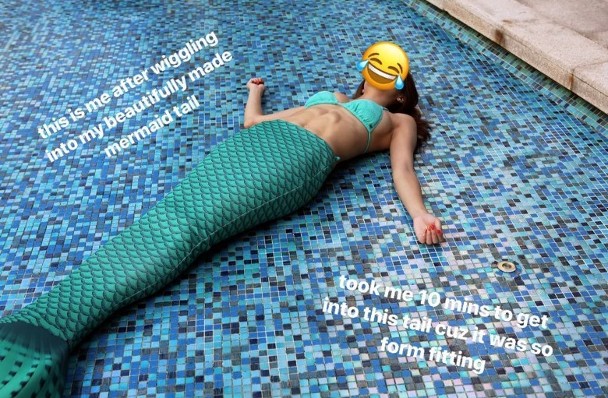 佢话睇开卡通片知道美人鱼系放弃声音变成人类,所以先可以上岸,而佢就话放弃后冠去完成梦想:“So one of my many dreams came true… but like Ariel, I had to give up my #crown to be a #reallifemermaid #(其中一个梦想我实现咗,好似美人鱼咁,我要放弃后冠去成为真正嘅美人鱼)”