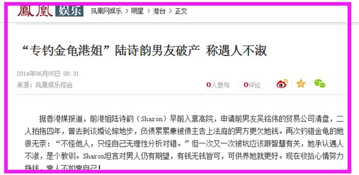而陸詩韻的前男友曾文能、朱明、吳銘偉、林炳昌等人雖然年齡都偏大,卻均是非富即貴,囙此她在香港娛樂圈中也多了一個“富豪狙擊手”的稱號,可惜陸詩韻雖然情史豐富,更曾為了嫁入豪門,不惜正面杠上陳法拉、周汶錡、孟廣美等女星,但結果還是竹籃打水一場空。