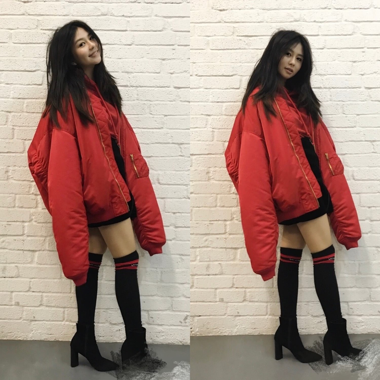 穿著大紅色外套,腳踩黑色高跟鞋,長髮披肩、笑容甜美,擺出酷酷的pose,小小年紀的沈月就已經走在時尚前沿啦!