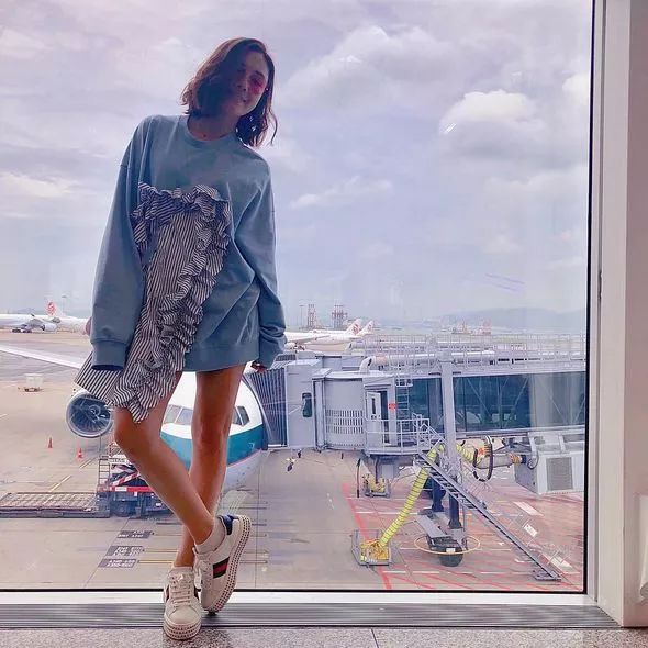 李施嬅這件拼布的寬鬆上衣跟男友風襯衫有異曲同工之妙,性感得來又活潑。