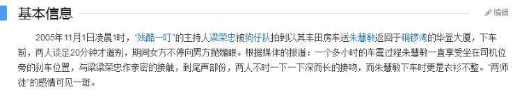 根據當時媒體的報導,梁榮忠開著一輛豐田停在了大路邊,被狗仔拍到副駕駛坐著的是港姐朱慧敏,二人在車上眉來眼去,時不時打長KISS,後來更是明目張膽在車上纏綿了一個多小時才肯停下來,下車後兩人都被拍到衣衫不整。