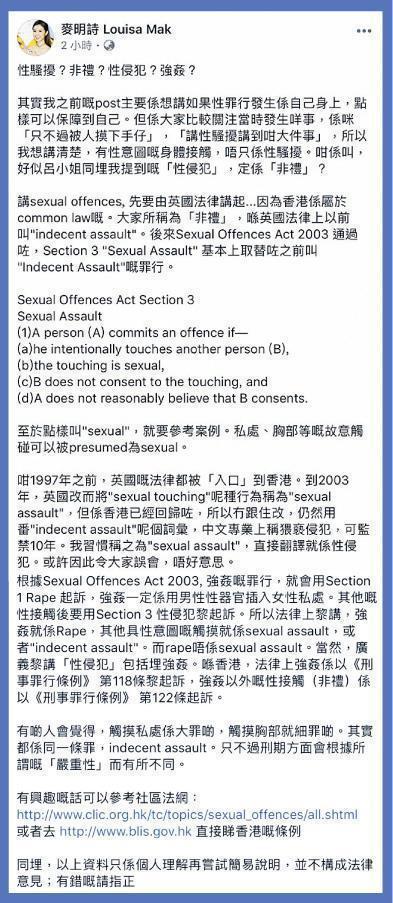 舊年12月,麥明詩喺社交媒體透露讀大學一年級參加內地交流團時遭性侵犯,單嘢引起關注。有人支持佢公開單嘢嘅勇氣,但都有人質疑佢借機炒作。麥明詩甚至撰文千字分析咩叫“性騷擾、非禮、性侵犯、強奸”。
