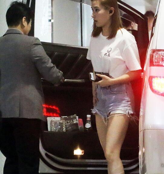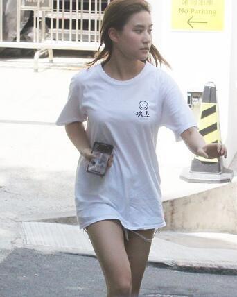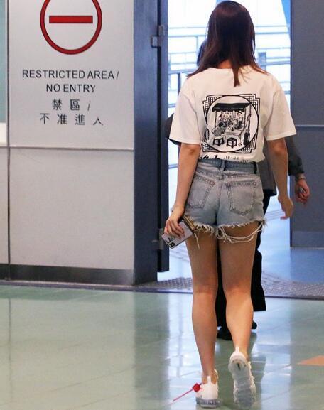 今次佢做人肉廣告牌,將自家品牌著出嚟做免費宣傳,熱褲+T恤,一對又白又長大腳勁吸睛,任記者影。