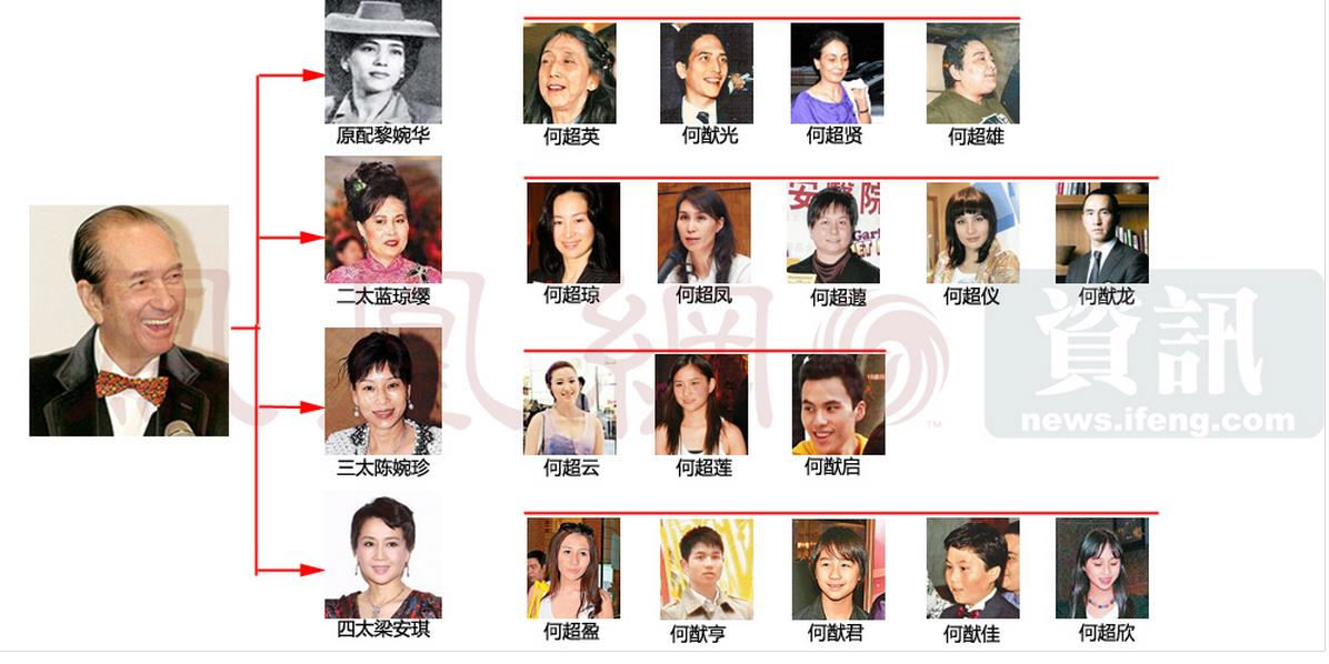 賭王何鴻燊風流聞名上流社會,家族人數眾多,共育有17個子女。