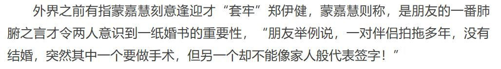 因為喺2013年嘅時候,蒙嘉慧就同鄭伊健兩人低調完婚,可以喺事業上升期急流勇退回歸婚姻,都系要好大勇氣啦。