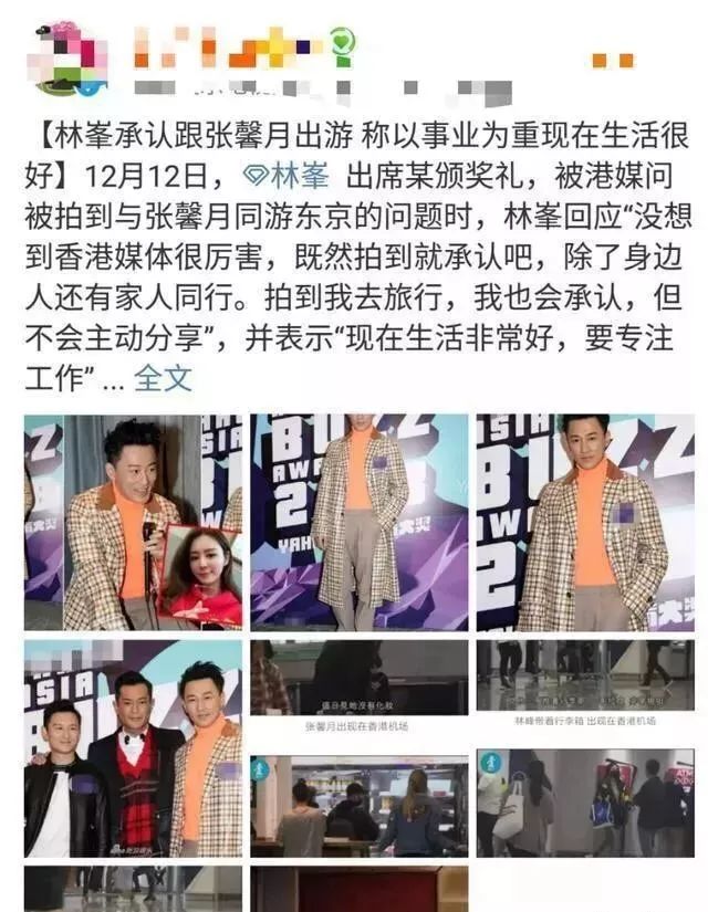 隨後,林峯出席活動時被問到此事,也是大方承認了張馨月的女友身份:“沒想到香港媒體很厲害,既然拍到就承認吧,除了身邊人還有家人同行。拍到我去旅行,我也會承認,但不會主動分享”,此外,林峯還表示“現在生活非常好,要專注工作”,自稱沒有時間結婚,“男人事業為先,工作對我很重要”。
