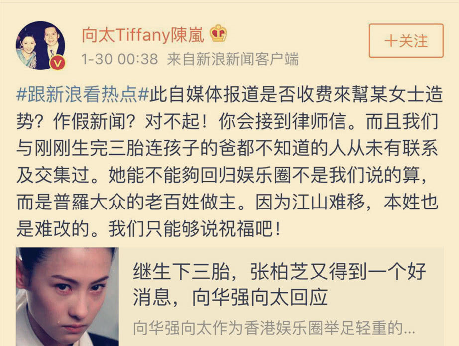 向華強太太陳嵐,一向直言直語。日前,佢因為一篇自媒體亂寫標題造謠,從而再次發聲,再登上娛樂頭條。直接炮轟話夠膽造假新聞就等住收律師信封啦。并講張柏芝系咪回歸娛樂圈,唔系佢哋“話事”,仲攞景咗一句:江山難移,本性都難改。
