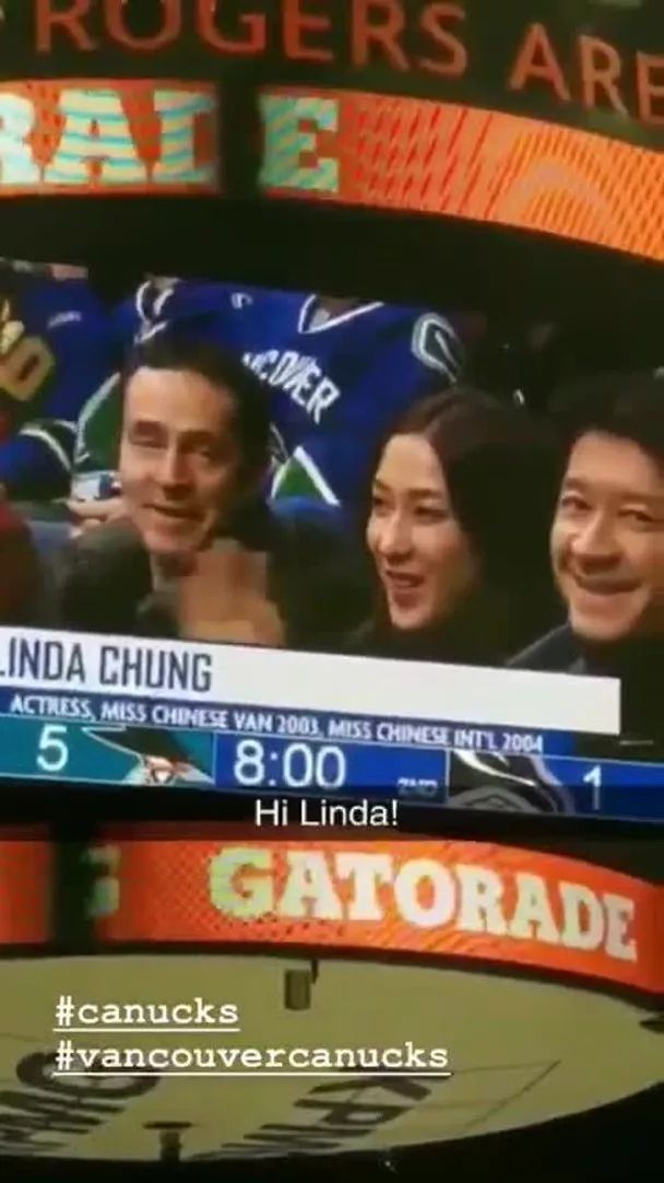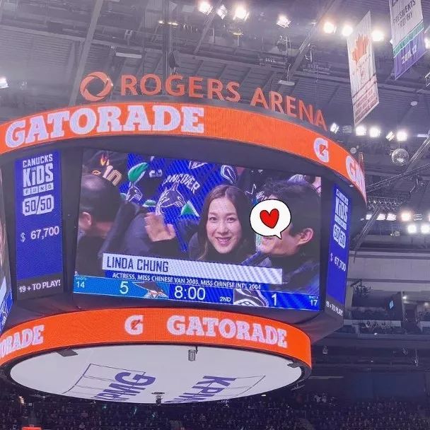 她在社交網上曬出兩張和老公的合照,夫婦二人原來抽空過二人世界,齊齊拍拖去看冰上曲棍球。相中可見,鐘嘉欣和老公都出現在場館的大電視螢幕中,而大會現場亦旁述介紹鐘嘉欣是2003年溫哥華華裔小姐以及2004國際華裔小姐總冠軍。