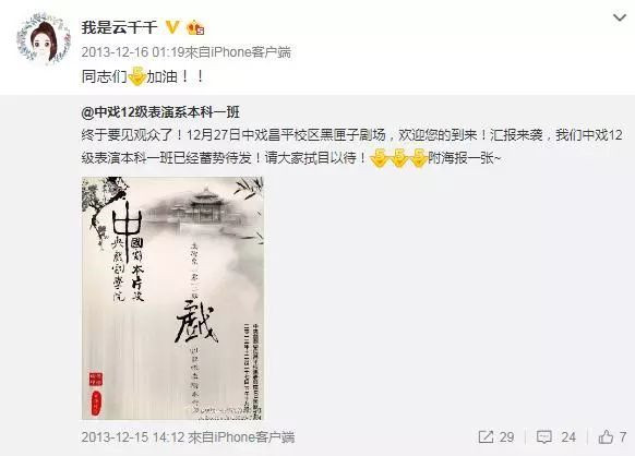 從雲千千早期的微博看,她畢業於中戲這一點應該是沒什麼可質疑的。