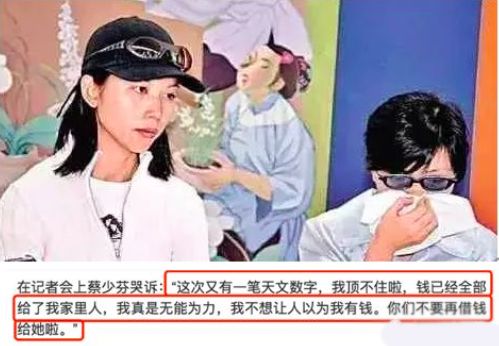 痛定思痛之后,2000年,蔡少芬召開咗記者招待會,佢哭訴道:「我頂唔住啦,錢已經全部畀咗屋企人,我真系無能為力喇。