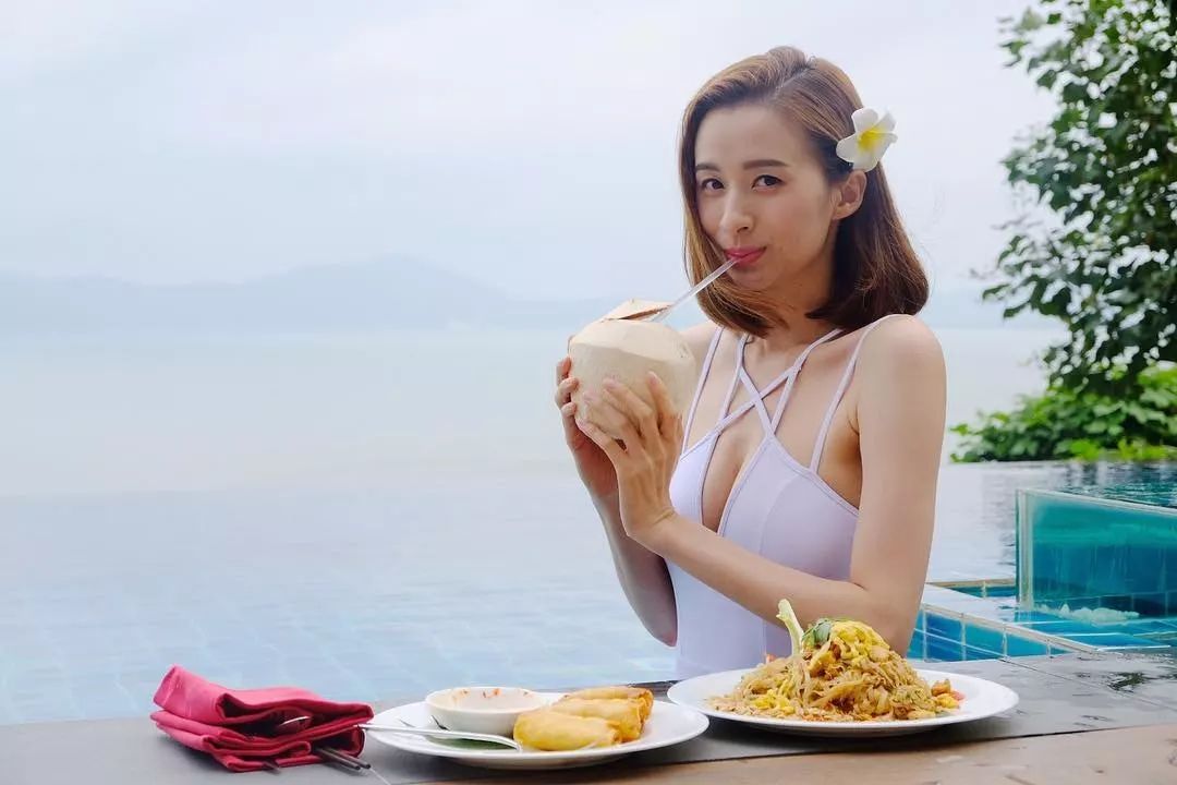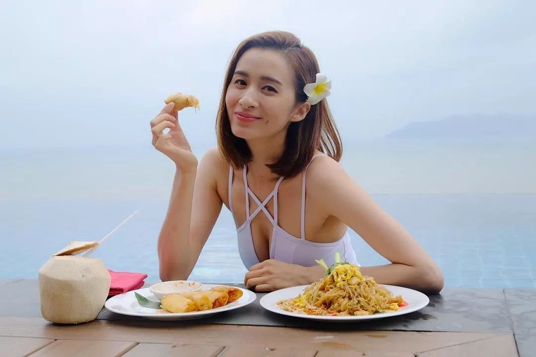 見沈卓盈喺泳池邊除咗騷身材之余,仲唔停享受美食。