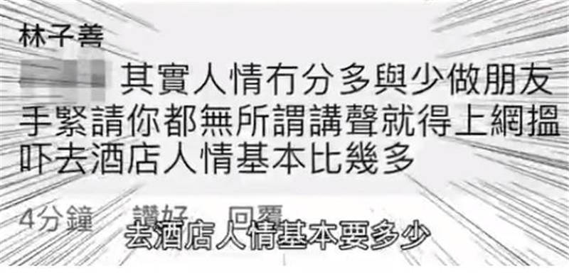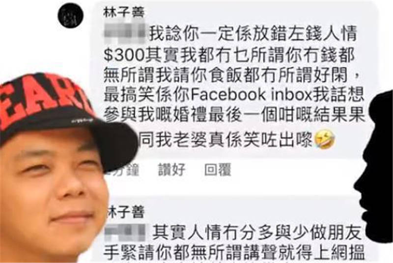 點知事隔一年,今日有網民向記者爆料,指當日林子善為咗300蚊「人情利是」同朋友反面。原來當晚擺酒之後,林子善曾經喺社交網站留言嘲笑友人,對話如下: