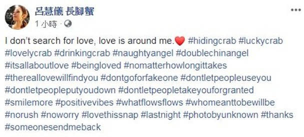佢喺社交平台曬出一張獨照,并以英文留言指毋須要專登去尋找愛,因為愛一早存在喺佢身邊!