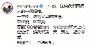 黃翠如留言:“一年前,送給我們兩個人的一個婚禮。一年後,送給父母的婚禮。有你們,就有愛。感謝我的爸爸媽媽,你的媽媽和天上的爸爸仔,讓我們這一天,聚在一起分享愛。那個早上,再遇彩虹。”