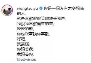 而蕭正楠亦情深表示:“我喜歡愛著你笑。請你一直快樂地笑下去和我走這一輩子。如果你不嫌棄…下輩子我們再約定…拍一下對方額頭就會記得對方。”