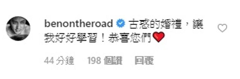 好友袁偉豪留言送上祝福,還說要偷師!他留言:“古惑的婚禮,讓我好好學習!恭喜您們❤️”難道他會選擇靜悄悄結婚?