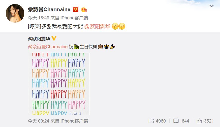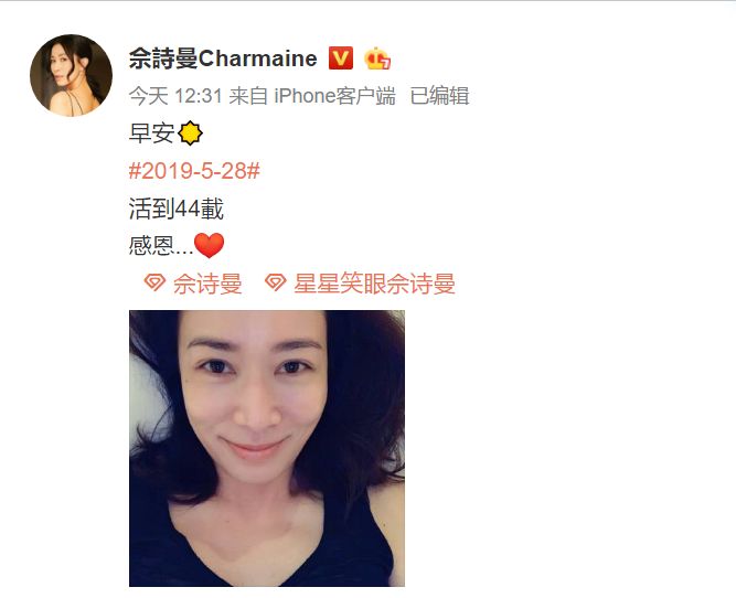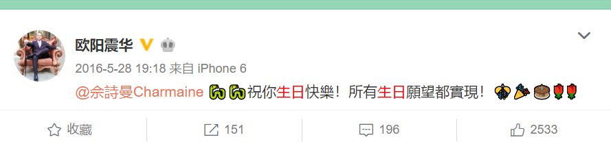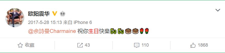 而圈中好友亦紛紛送上祝福,當中包括連續八年冇間斷嘅歐陽震華(Bobby),兩個人早年喺《洗冤錄》、《法證先鋒》有多次合作,關係融洽好似兄妹一樣!雖然歐陽震華喺社交平台只系簡單一句「生日快樂」,但佢發文時間喺28日嘅零晨12點半,絕對系誠意嘅表現。