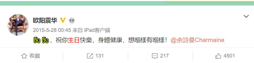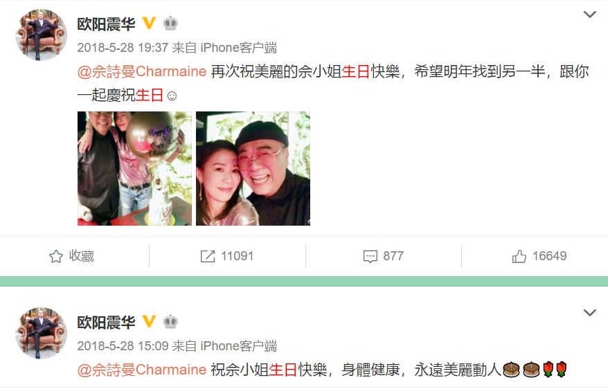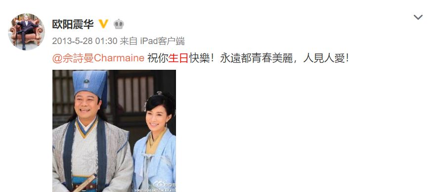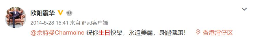 連續八年連續8年送上祝福,歐陽震華同佘詩曼足見兩個人感情深厚。