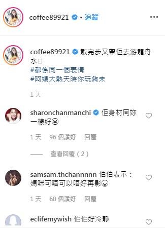 不過此時此刻,林芊妤與懷中嘅「米芝蓮」仔仔形成咗好大嘅對比,而佢都喺社交平臺大曬靚相,留言寫道:「散完步又帶佢去游龍舟水#都系同一個表情#阿媽大熱天時你玩夠未」。