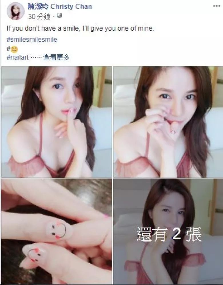藝人陳潔玲(Christy)系唔少宅男女神,皆因佢次次喺網上分享嘅相,都好噴血。呢日Christy就喺社交網大曬「四格連環床照」,更加疑似真空上陣!坐喺床上佢曬出深長事業線,仲擺出多個賣萌相,又都嘴,又將手指擺喺嘴唇,原來佢做咗指甲,要騷畀大家睇!