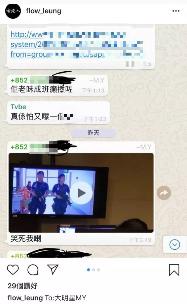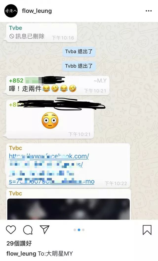 呢排梁裕恒又有料爆,佢喺IG貼咗三張WhatsApp截圖,當中見到一個電話簡稱「M.Y」嘅人,評論敏感話題,冇幾耐就有人陸續離開群組,M.Y再留言:「嘩,走兩件。」并附以4個笑到喊表情圖案。
