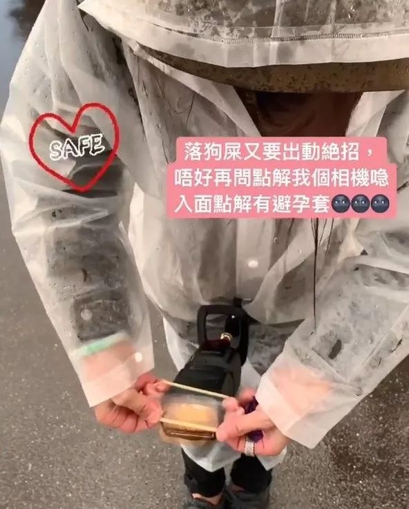 佢仲留言寫道:「落狗屎又要出動絕招,唔好再問點解我嘅相機箱里面,點解會有避孕套!」用避孕套套住攝影器材防水,認真夠絕,唔怪得令一眾網民嘩然之余,同時亦都覺得嘆為觀止。