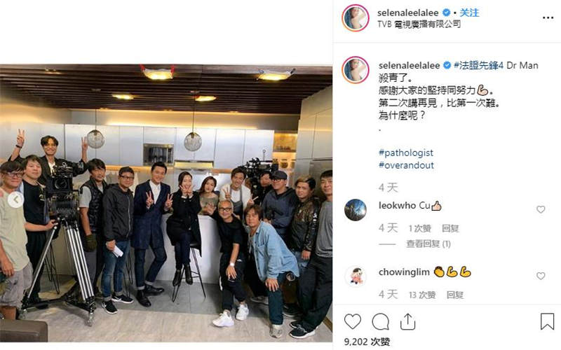 “#法證先鋒4 Dr Man 殺青了。感謝大家的堅持同努力??。第二次講再見,比第一次難。為什麼呢?”佢曬咗一段視頻帶大家參觀TVB,更多次講到再見TVB,令唔少網友睇完之後都留言想喊,唔舍得佢離開TVB。