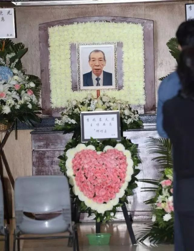 靈堂以簡潔為主,中央掛上”主懷安息“嘅橫匾,下方擺李兆基著上西裝嘅彩色遺照,其太太就送上粉紅心形花牌,一早到場打點。