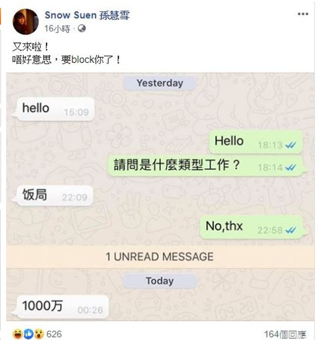 孫慧雪回復對方“No,thx”。對方馬上表示“1000萬”。孫慧雪喺社交平臺公告此事,并指“又來啦,唔好意思,要Block你啦!”