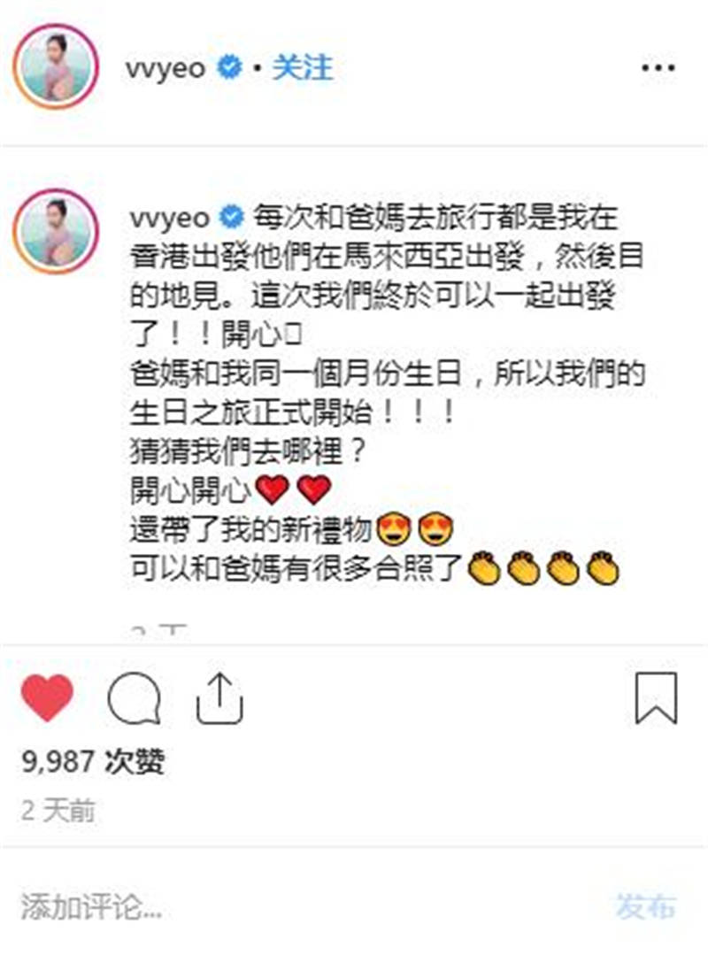 佢仲喺社交平台開心留言:「每次同爸爸媽媽去旅行都系我喺香港出發,佢哋喺馬來西亞出發,然后目的地見。今次我哋終于一齊出發啦!真係好開心!爸爸媽媽同我同一個月份生日,所以我哋嘅生日之旅正式開始!”