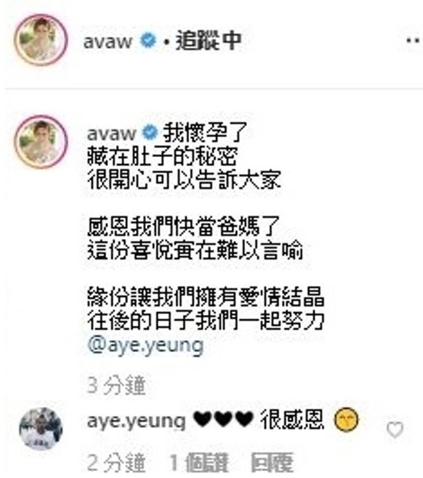 楊政龍對此回復傳媒:“好開心同大家宣宣佈女朋友黃子菲有咗BB,暫時照顧好女朋友同BB健康為先,多謝大家嘅祝福。”