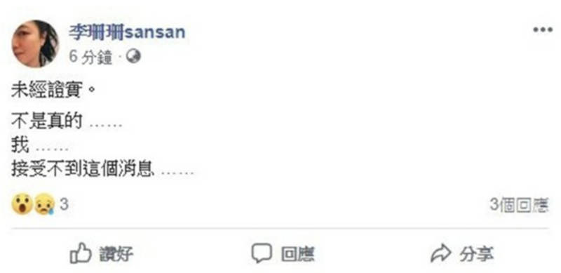 1996年香港小姐冠軍李珊珊發文表示接受呢個消息:未經證實,唔系真嘅,我接受唔到呢個消息……