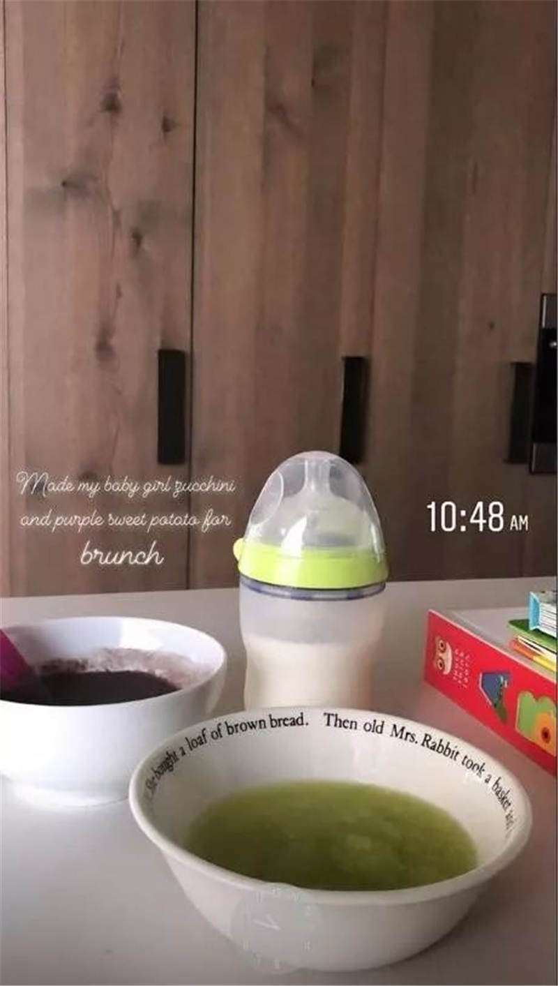 謝婷婷仲分享為囡囡炮制愛心嘢食嘅相,除咗奶之外,佢仲將翠玉瓜同紫薯做糊仔,畀囡囡吸收多啲營養。