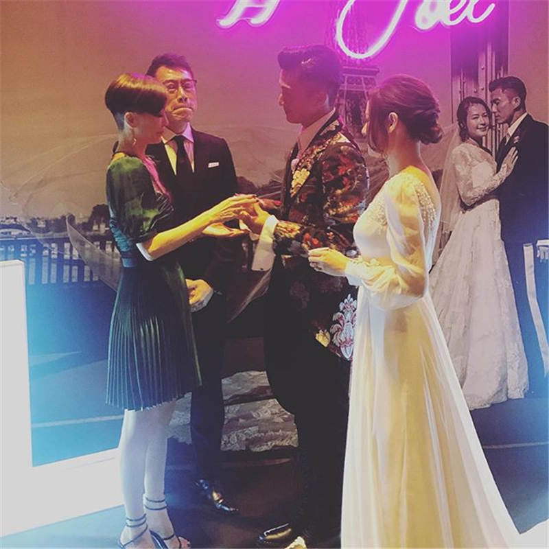 伍詠薇之後留言話:「恭喜山聰萍果仔大婚之喜❤️分享今晚婚宴溫馨熱鬧又感動嘅時刻????? 細佬,大個仔啦⋯⋯好好做人老公,恩愛滿滿??❤️❤️」