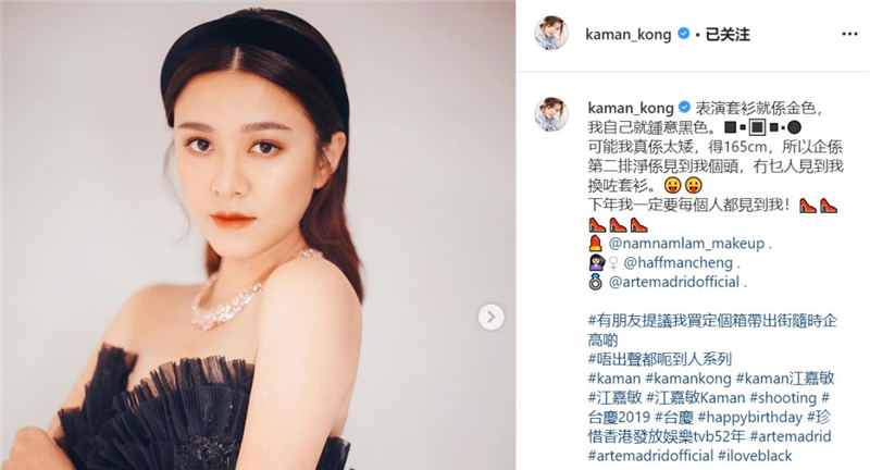 江嘉敏話:「表演套衫就係金色,我自己就鍾意黑色。可能我真係太矮,得165cm,所以企係第二排淨係見到我個頭,冇乜人見到我換咗套衫。??下年我一定要每個人都見到我!?????」