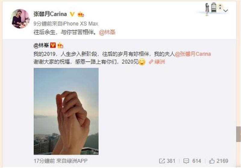 林峯更高調曬出:兩個人手拖手婚戒嘅相,真係好甜蜜。而張馨月轉發同留言:「往後余生,與你甘苦相伴」