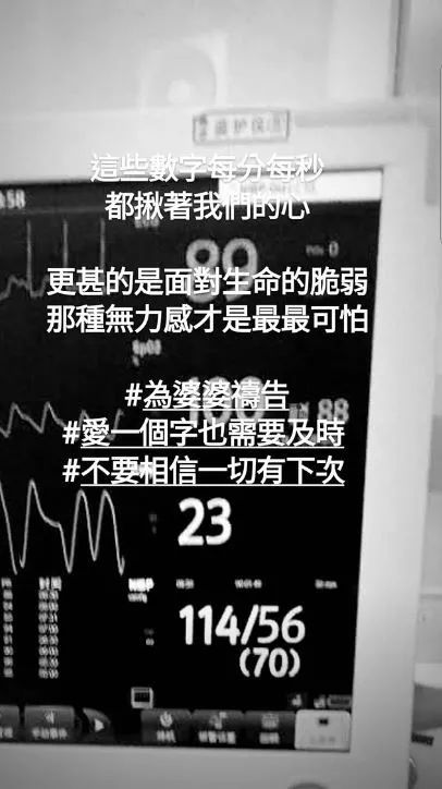 2015年港姐季軍郭嘉文(Karmen)自從被「小小超」李澤楷私有化,升呢做「楷女郎」的佢離開TVB后唔使做,隨時候命陪男友去旅行,生活開心快活;不過,尋晚Karmen喺社交網站的限時動態張貼身體監測器相,為病重入院的婆婆。禱告:「啲數字每分每秒都揪住我的心,生命真系好脆弱,個種無力才先系最最可怕,為婆婆禱告,愛要及時,唔好信一切有下次。」
