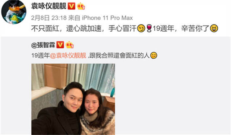 張智霖喺社交平臺曬出一張兩個人頭貼頭合照,并留言:「十九周年,同我合照仲面紅嘅人。」袁詠儀就甜蜜回應:「唔單止面紅,仲會心跳加速、手心出汗,十九周年,辛苦你喇。」