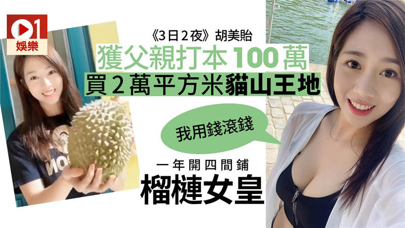 胡美貽喺2018年開設以榴連為主題嘅甜品店榴連樂園,短短兩個幾月又開2間分店,舊年中,佢更與友人合資700幾萬,喺馬來西亞彭亨洲買落30畝榴連地,大展拳腳。