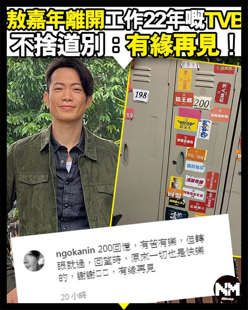 日前,43歲嘅敖嘉年終于正式離開TVB,佢喺社交平臺留言返TVB交員工Locker嘅心情。