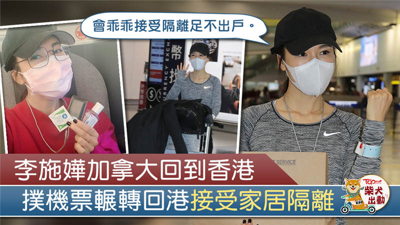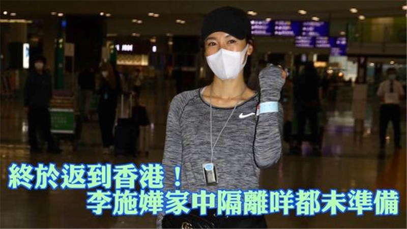 李施嬅喺尋日傍晚5時45分,見到佢推住行李出抵港大堂,戴上黑帽、口罩、心口掛有迷你空氣凈化機,左手佩戴追跡手帶,影相期間佢向傳媒展示家居檢疫嘅有關文件。