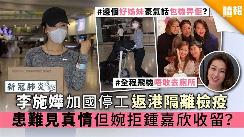 終于返香港嘅李施嬅表示松咗一啖氣,并指等機票都等咗一個禮拜,好彩前晚收到好消息,可以即時改機票返香港。記者問到檢疫過程順唔順利?李施嬅指半個鐘內完成所有手續。