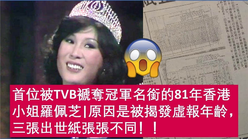 但卻畀越洋舉報虛報年齡,指羅佩芝參選港姐嗰陣虛報年齡,TVB最后將佢冠軍資格取消,并由亞軍勞錦嫦替補,當年可以講真係震驚咗成個娛樂圈。