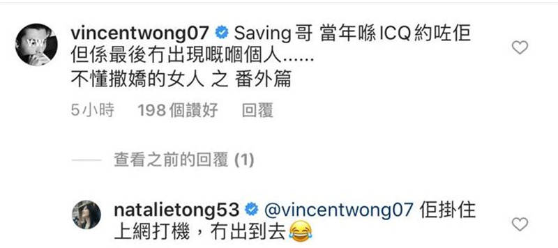 好姊妹黃翠如見到相之後,即刻留言講:「Hi cute cool girl」,而好拍檔王浩信就留言:「Saving哥當年喺ICQ約咗佢,但最後冇出現嘅嗰個人……不懂撒嬌的女人之番外篇!」