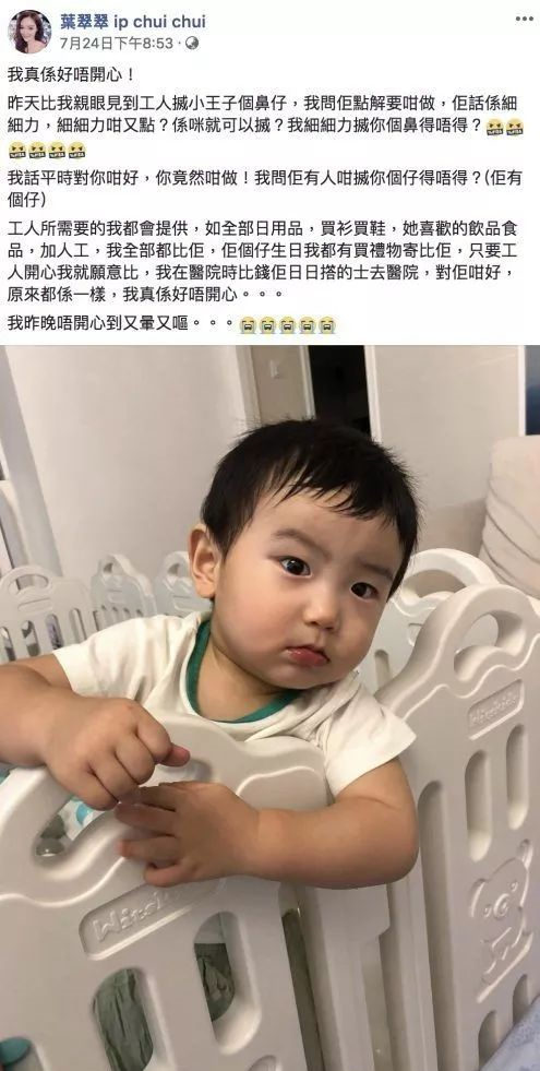 囝囝不過,最近葉翠翠就于個人社文網與網友公開駁火,互相隔空對罵。事源系葉翠翠于上星期二發文,指自己好唔開心,因為佢親眼見到工人搣大仔“小王子”個鼻,單嘢令佢覺得好不滿,并問工人點解要咁樣做,最后翠翠仲話,因為太唔開心而又暈又嘔。