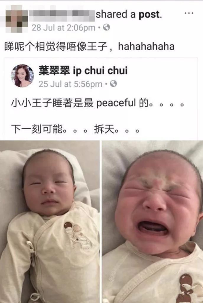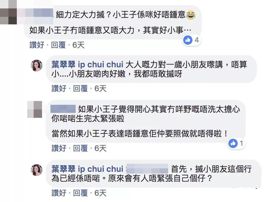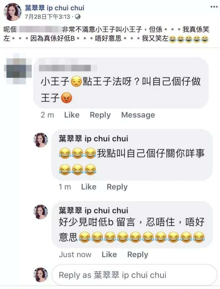 其后,葉翠翠再次發文,表示有網民留言唔滿翠翠叫自己個仔做小王子,結果又再一次令翠翠呢位媽咪覺得好不滿,指自己點叫個仔唔關其他人事,又指對方的留言低b。