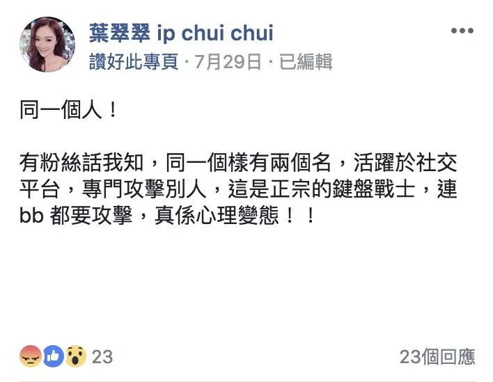 不過,翠翠一直都有留意留言批評佢的網民,指原來有鍵盤戰士活躍于社交平臺同專門攻擊人,并為囝囝受網絡言攻擊而護航,直斥對方心理變態!