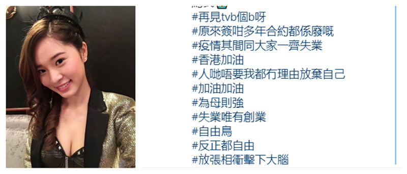 但有細心嘅網民發現,楊嘉欣似乎暗示咗不獲TVB續約有啲不滿,事關佢TAG表示:「#再見tvb個b呀#原來簽咁多年合約都係廢嘅#」,都唔少網民都留言鼓勵佢唔好灰心:東家唔打打西家、有危先有機。