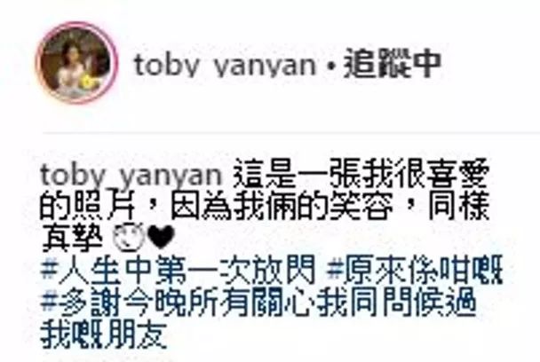 而喺Toby的社交網更寫住,這系人生中第一次放閃,終於明白有咩感覺。唔少網民都留言講開心見到佢拍拖,仲祝福佢要幸福!